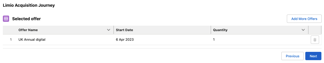 The Limio Acquisition Journey supports a tabular format for the selected offer, also supporting inline editing.