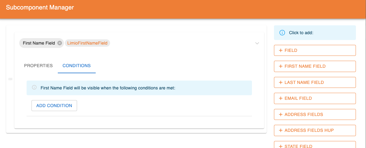 This will determine when a subcomponent should be visible based on the specific criteria that you select. Expand the Subcomponent accordion and navigate to the Conditions tab to get started
