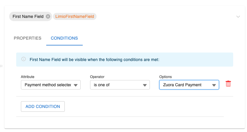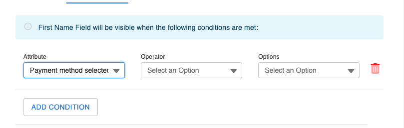 my First Name Field will now only show if that condition is met by the user. If they select the Card payment option, it will be visible. If they select any other payment method, they will not see the payment field.