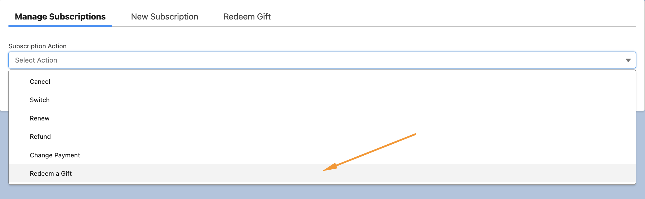 This can be done by selecting a subscription from the list, and choosing "Redeem a Gift" from the list of Subscription Actions: