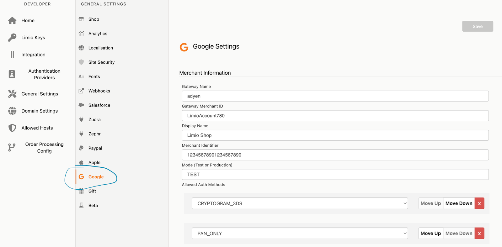 Screenshot: Access the Google Pay settings in Limio Settings > Google.