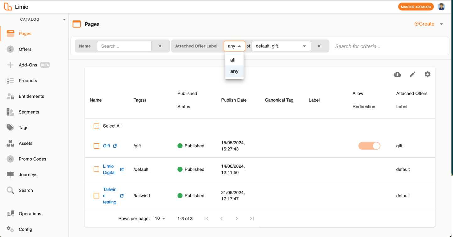 - Choose between ALL or ANY operator for attributes with multiple selectable values. For example, if you want to show all page results where attached offer label is either OfferA OR OfferB, then you could configure the filter to show ANY. If you wanted to show all page results where attached offer label has both OfferA AND OfferB, then you could configure the filter to show ALL.