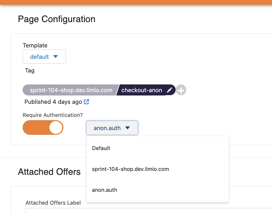 - Pages: Require authentication, attached offers label, attached add-ons label