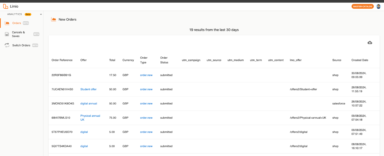 Our new Orders report displays order data for all new and renew order types in the last 30 days. This table is exportable so you can analyse the data with your preferred method. In the future, we plan to show key insights and metrics based on this report so you will not need to analyse the data external to Limio.