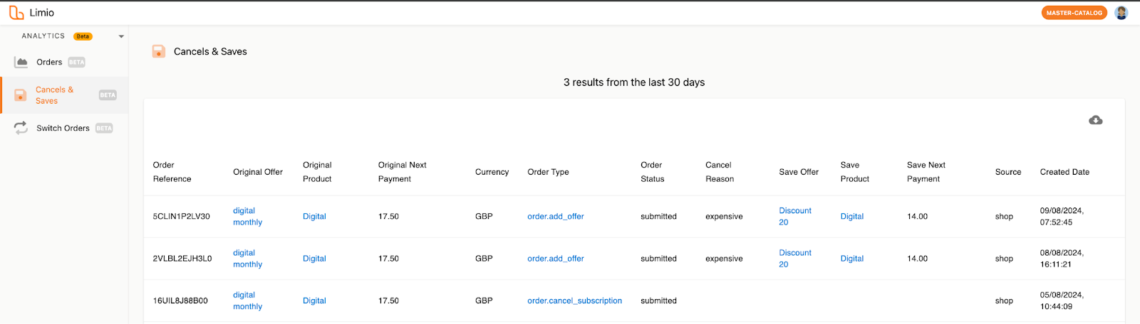 Our new Cancels and Saves report displays order data for all cancellation order types in the last 30 days. This table is also exportable.