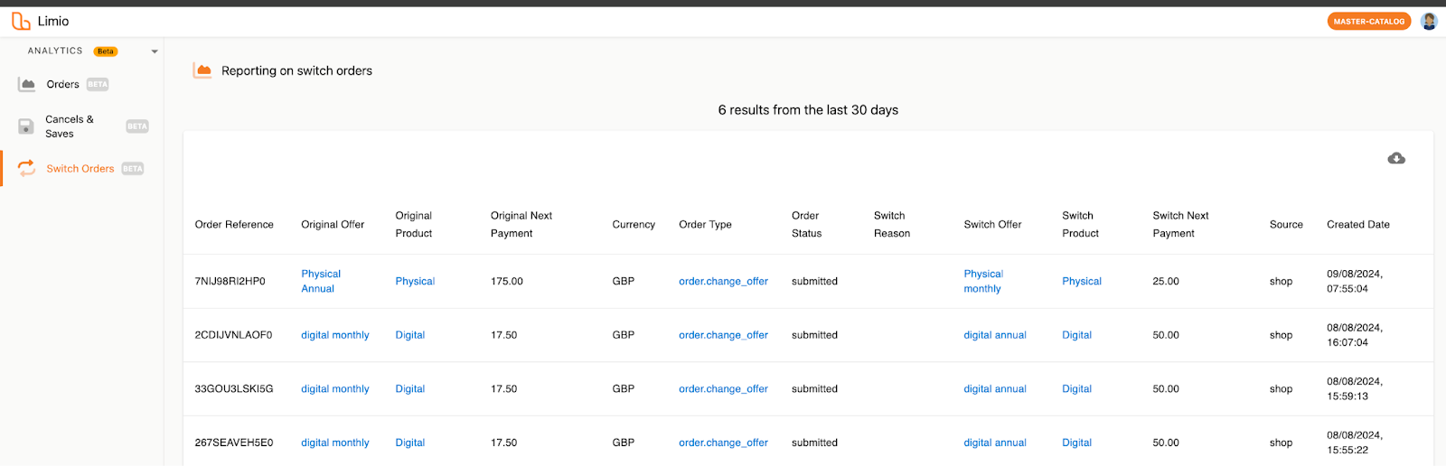 Our new Switch report displays order data for all switch order types in the last 30 days. This table is also exportable.