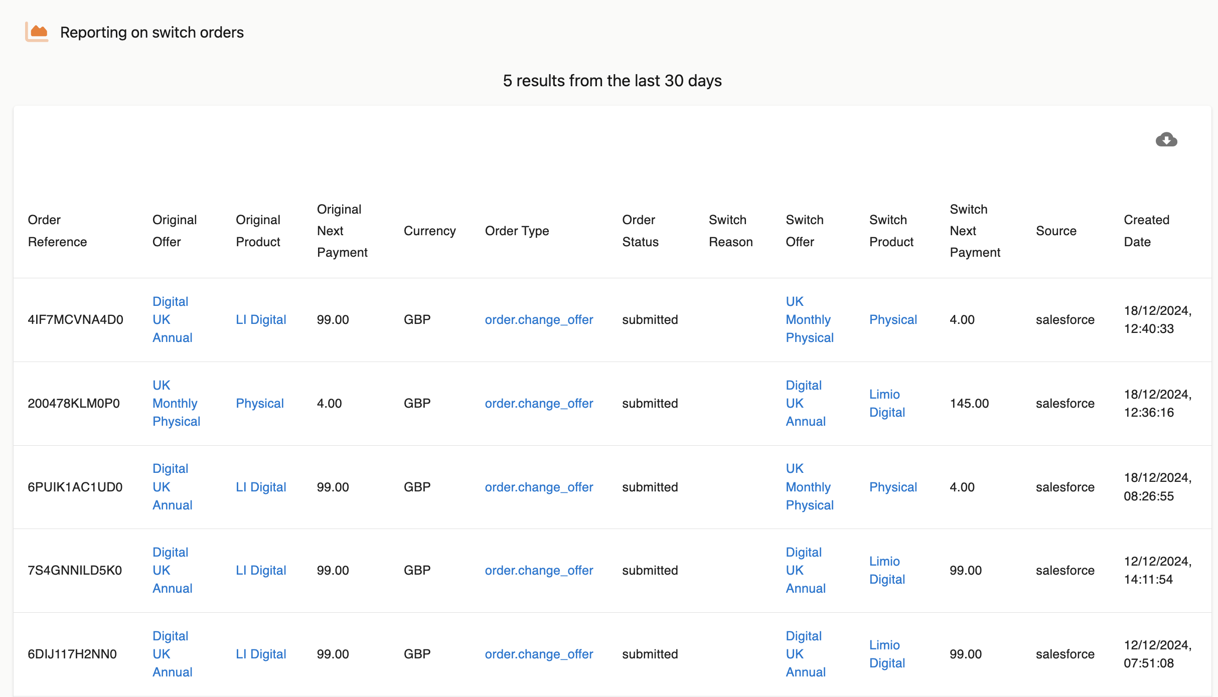 The Switch report displays all orders from the last 30 days that are order.change_offer. Order.change_offer can be triggered from a switch journey or a cancel/save with a new offer. This report can be exported for easy data analysis.