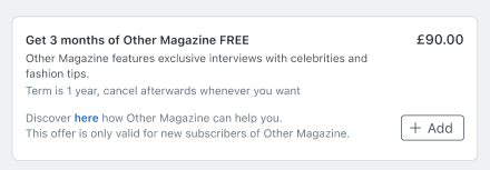 Cross-selling is a strategy that encourages customers to add related or complementary offers to their existing basket. With subscriptions, cross-selling usually means offering an add-on or a related product that enhances the current subscription plan.