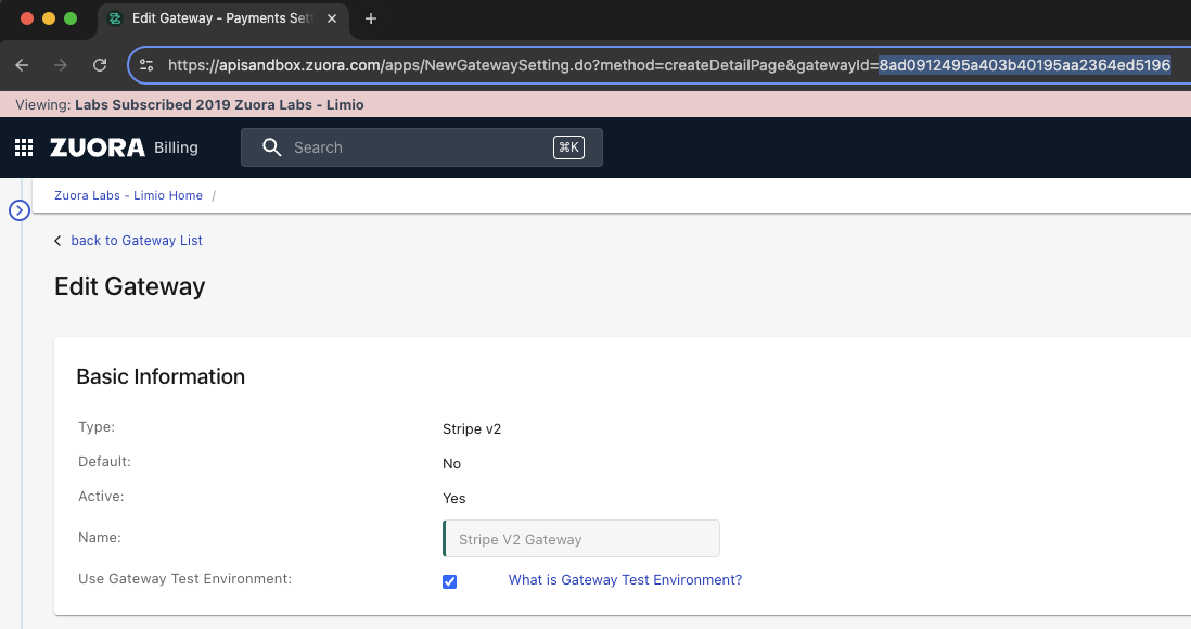 Zuora Payment Gateway ID can be retrieved from the Zuora page for the Stripe payment gateway you created in Zuora earlier. It will be visible in the URL bar gatewayId=XXX