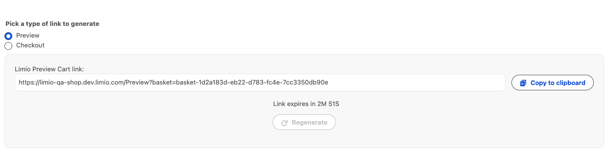 In the View Cart and Generate Links screen, you will see two Limio Initiate Checkout components: they are meant to contain different page tags - for preview and checkout.